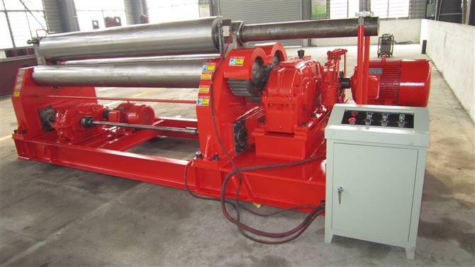 本機(jī)結(jié)構(gòu)型式為三輥對(duì)稱式,上輥在兩下輥中央對(duì)稱位置作垂直升降運(yùn)動(dòng),通過(guò)絲桿絲母蝸桿傳動(dòng)而獲得,兩下輥?zhàn)餍D(zhuǎn)運(yùn)動(dòng),通過(guò)減速機(jī)的輸出齒輪與下輥嚙合,為卷制板材提供扭矩,本機(jī)床結(jié)構(gòu)緊湊,操作維修方便。